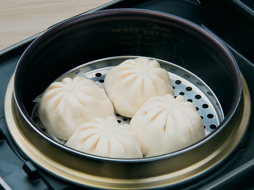 内锅放上蒸笼、摆入超市买回的速冻包;合盖开始烹饪,结束后即可食用。