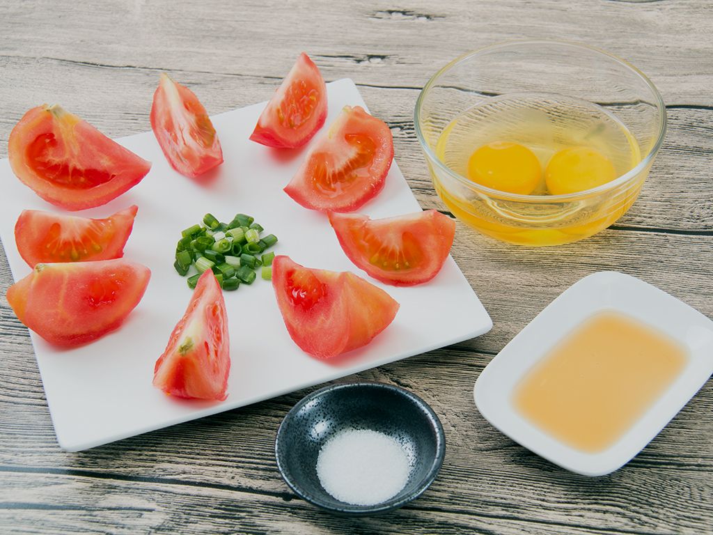 准备好食材;番茄划十字刀泡于热开水中30秒,撕去表皮。番茄去皮后切块,葱切成葱花,鸡蛋100克打入碗中打散备用。