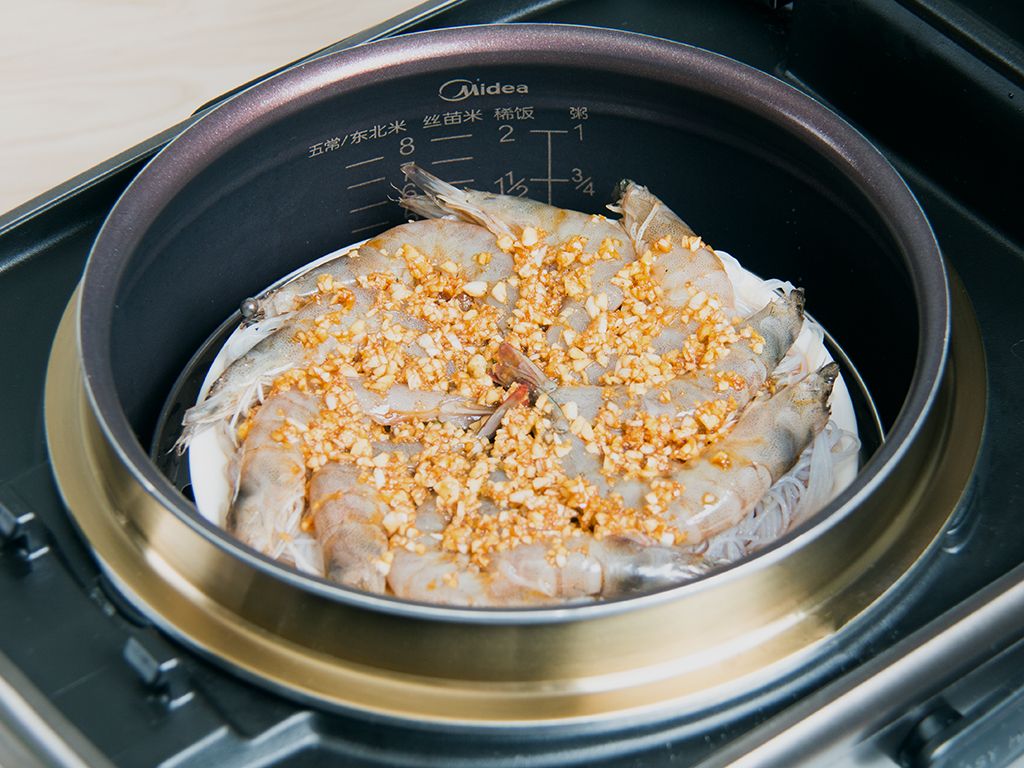 将泡软的粉丝沥干铺到盘底,把腌好的虾摆放到粉丝上。碗里放生抽30毫升、蒜蓉5克、芝麻油10毫升、白胡椒粉2.5克、白砂糖5克搅匀,均匀撒到虾上。整盘加入饭煲蒸笼上,合盖开始烹饪。
