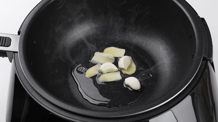 2、放入食用油2大勺、生姜5片、盐2小勺。