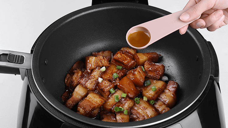 5、放入陈醋2小勺合盖收汁到浓稠,收汁结束,放入葱花、麻油1大勺拌匀出锅。