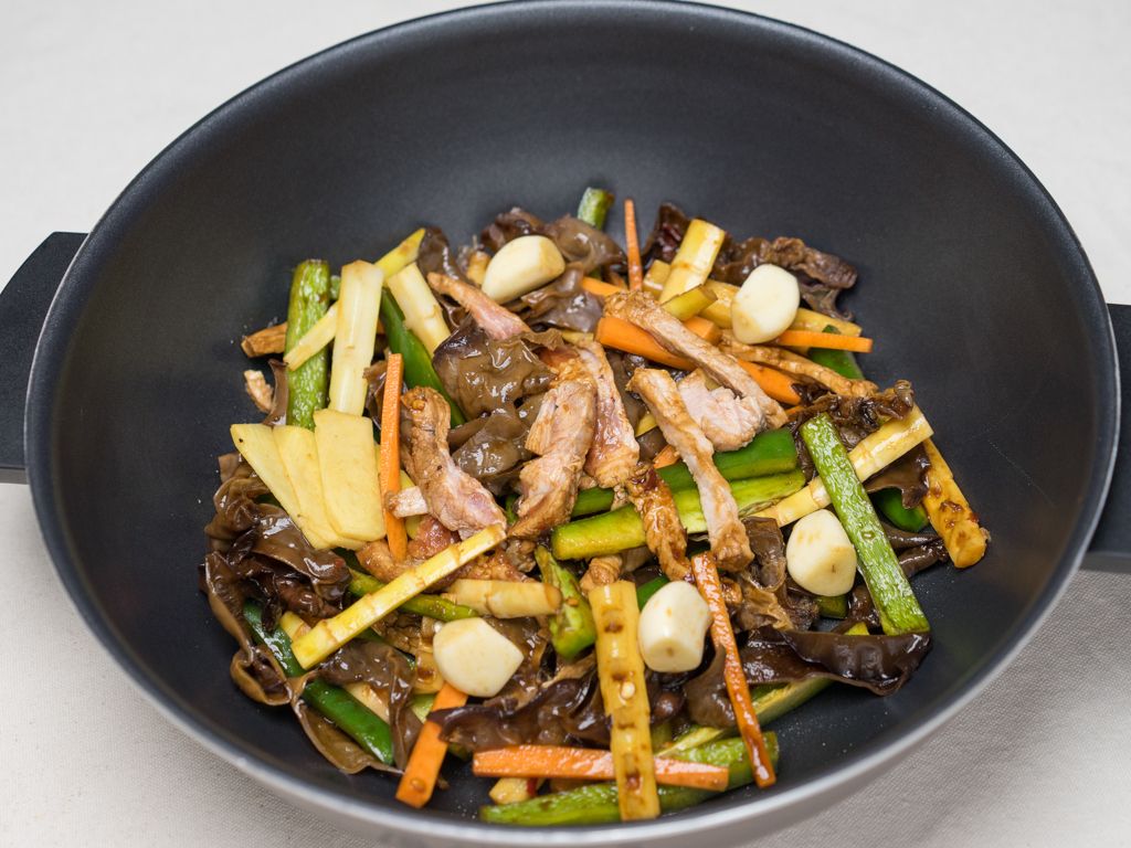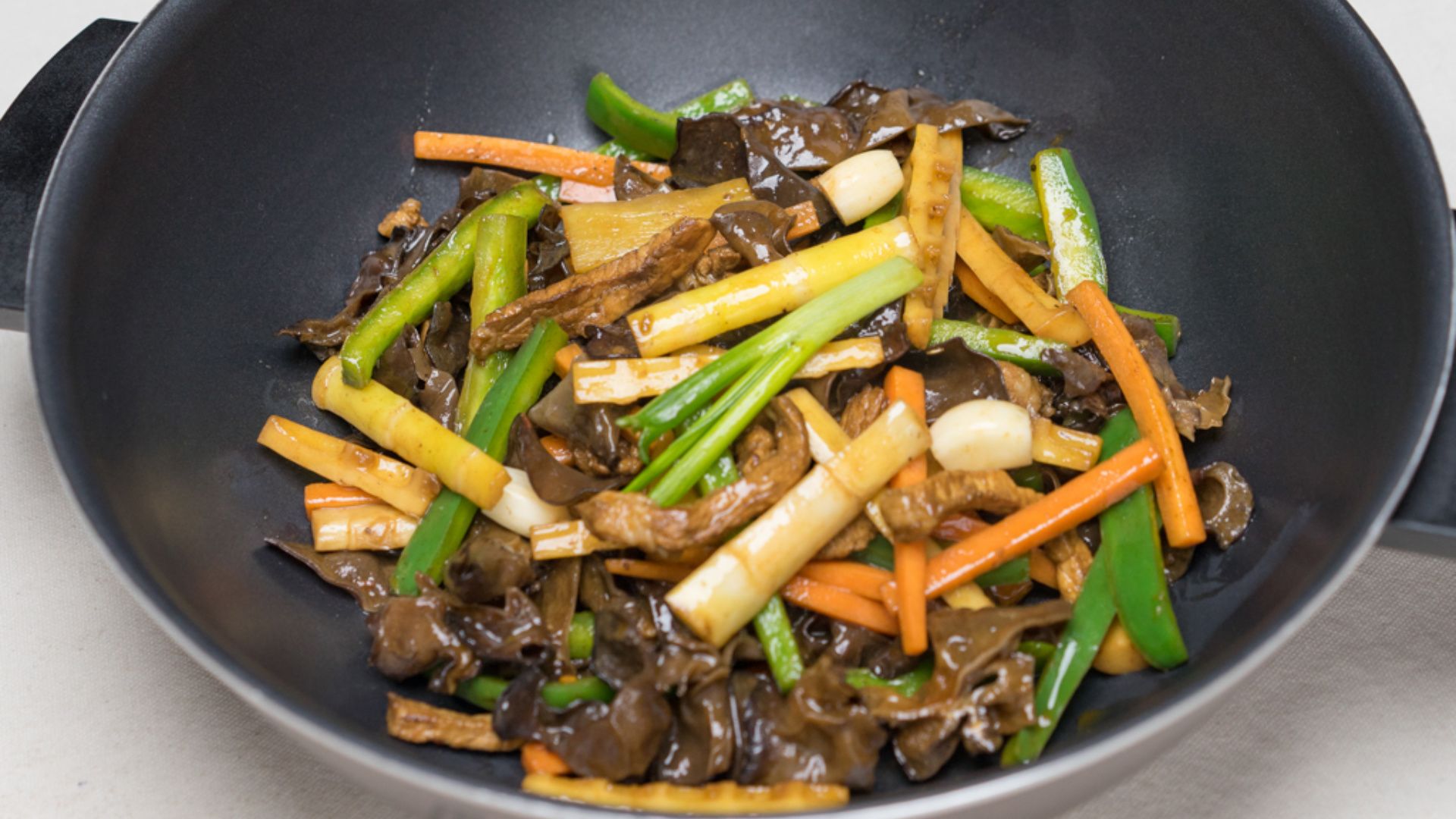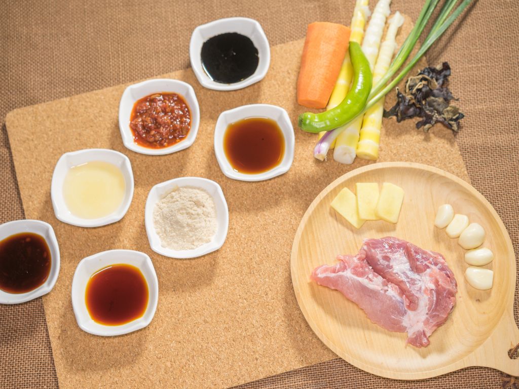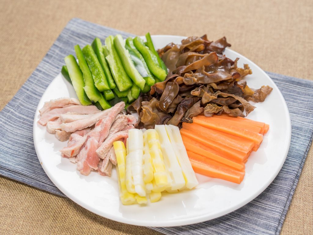 将里脊肉过水5分钟切丝,木耳、冬笋、青椒、胡萝卜切丝