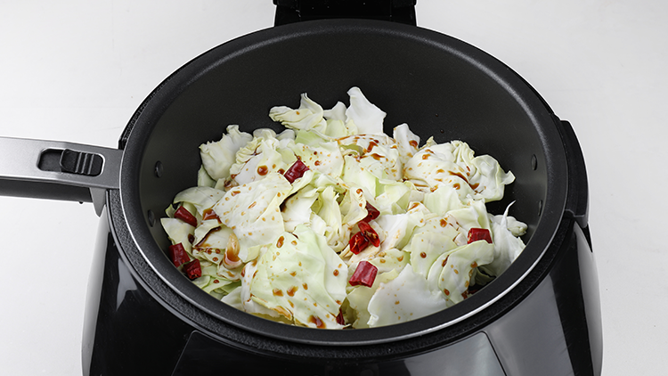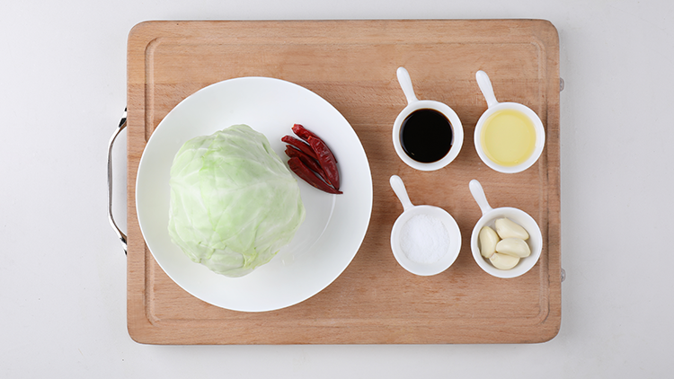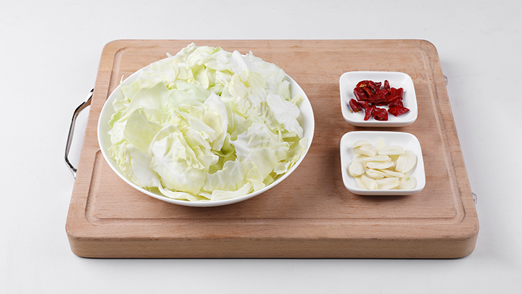 锅中留油,烧六成热将辣椒段和大蒜片炸出香味,调至大火,放入包菜爆炒至半熟,放入五花肉片、香醋和少许食盐