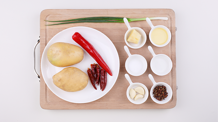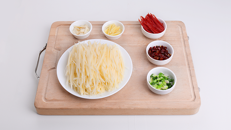 土豆去皮切丝,红椒洗净去籽切丝,干辣椒切段,葱切葱花,姜切丝,蒜瓣切片。