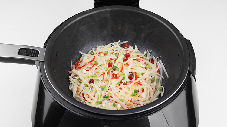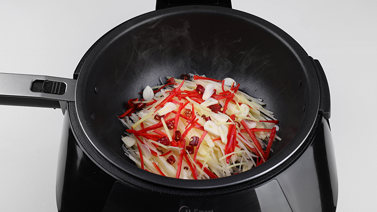 锅热倒油,将土豆和其它原料放入锅中翻炒片刻
