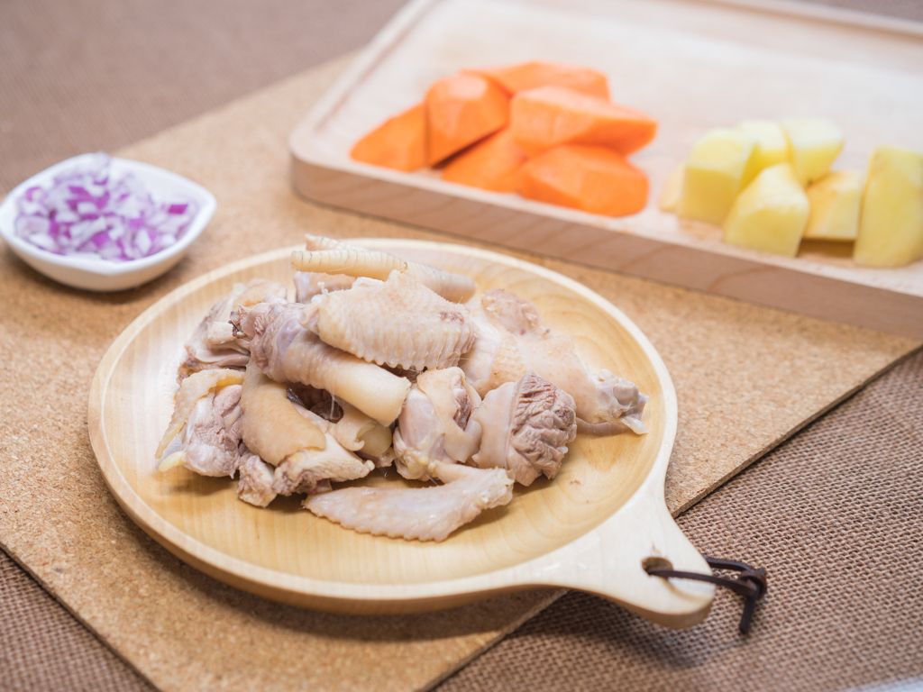 将鸡切块过水,土豆切块,胡萝卜切块,洋葱切末