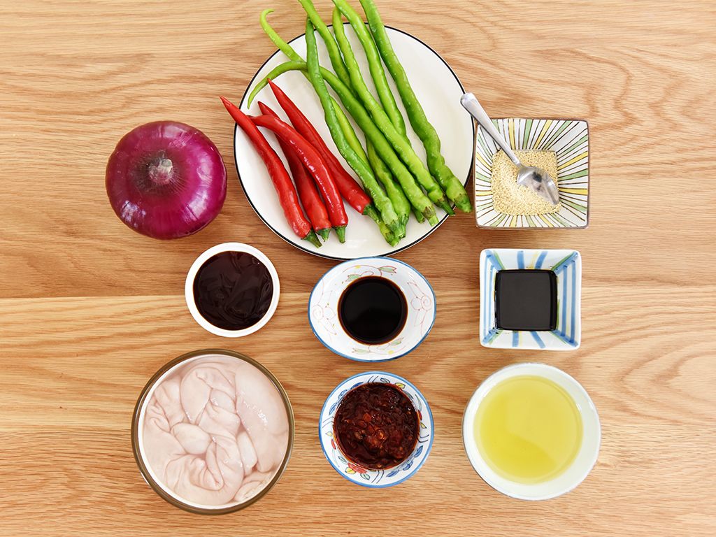 将肥肠过水30分钟切小段、辣椒切片、洋葱切丝