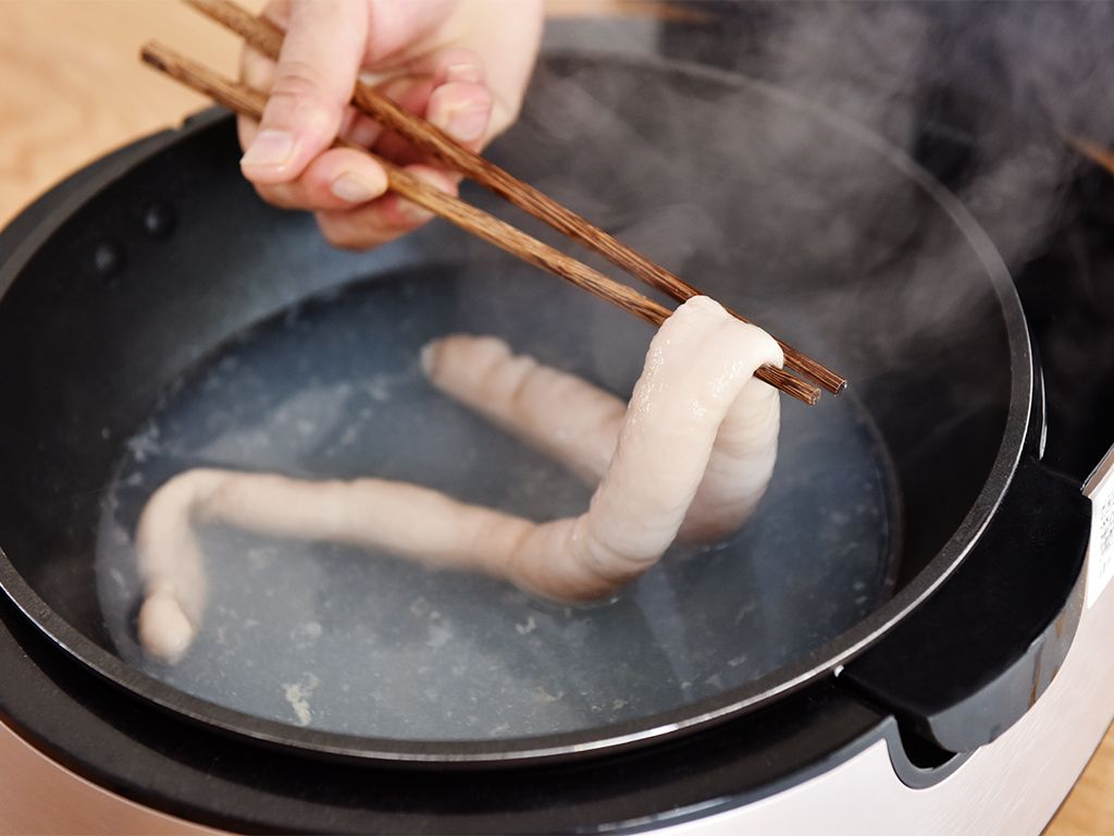 1.清洗肥肠以左手捏住肠头的一端,右手把肠子向内翻转后置盆内,加精盐、醋一起抓捏,去净肠子上的粘液,用清水搓洗两次