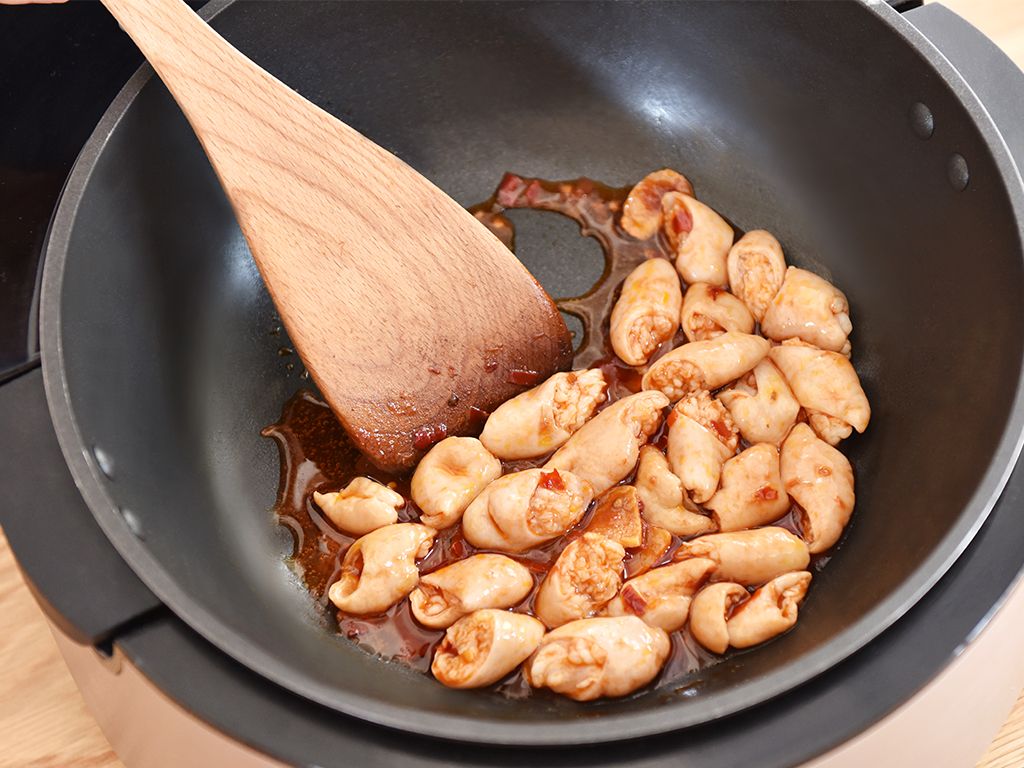 炒锅置旺火上,倒入花生油,烧至七成热,将肥肠下锅,边炸边用锅铲拨动,至肥肠呈金黄色时捞出,沥油