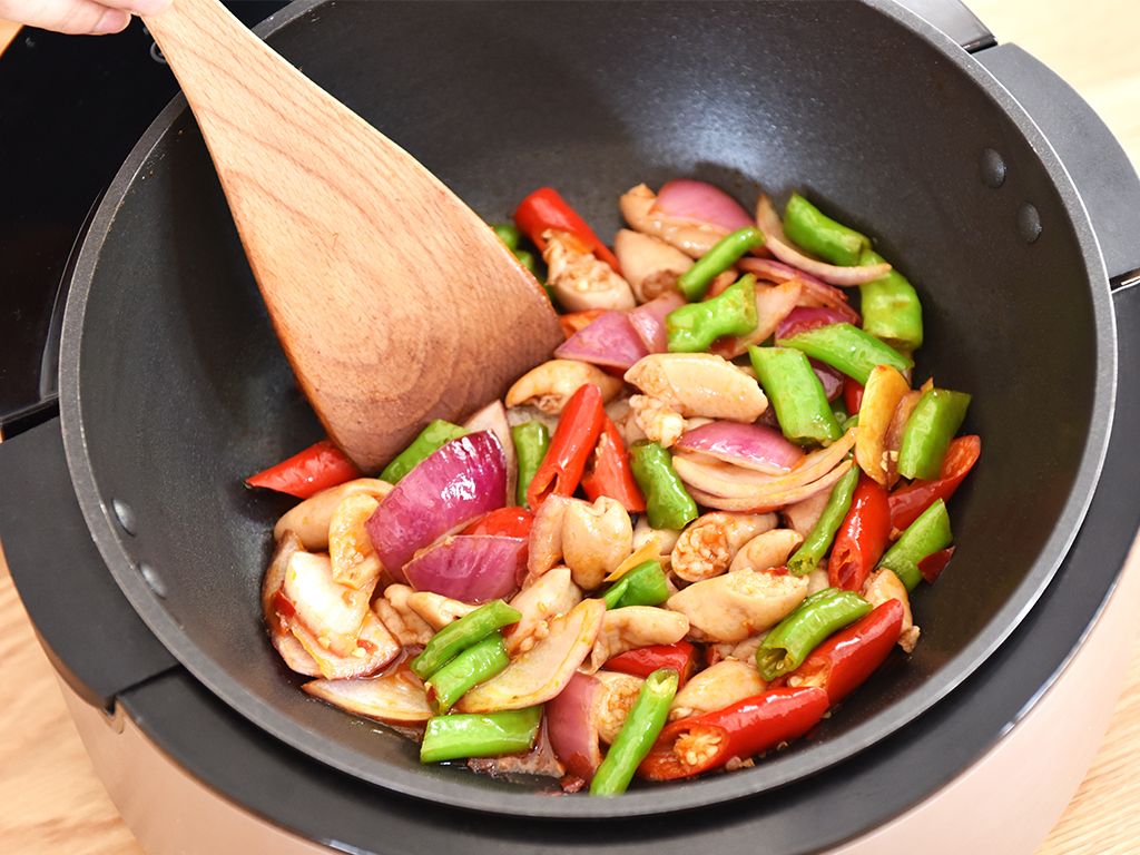 炒锅置旺火上,下熟猪油,将大葱段下锅稍煸,加入黄酒、姜末、青红辣椒、洋葱、酱油、精盐和肥肠,即端锅在小火上烧5 分钟,再移锅到旺火上烧1分钟,加鸡精,用湿淀粉勾芡,淋入熟猪油起锅盛盘即成