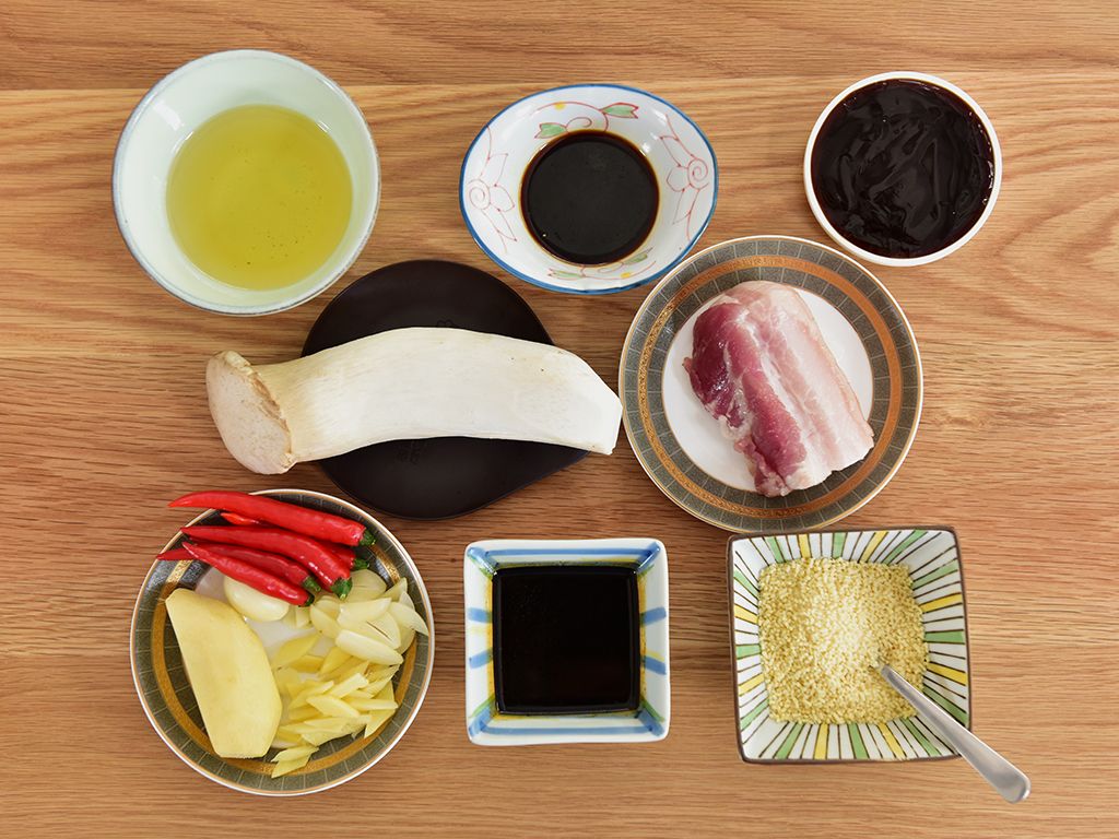 将五花肉过水5分钟切条、杏鲍菇切条。