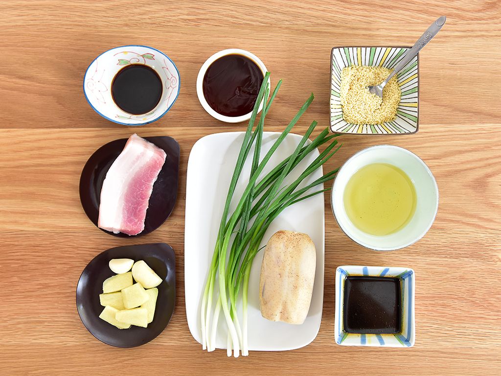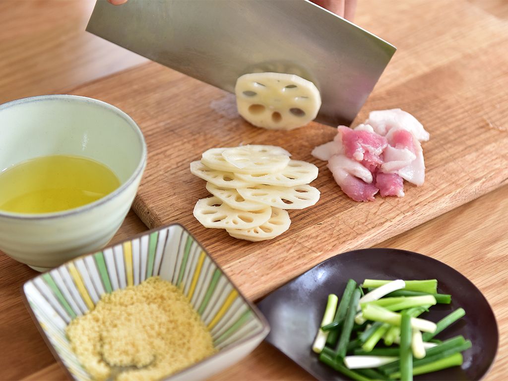 将五花肉切片、莲藕切片