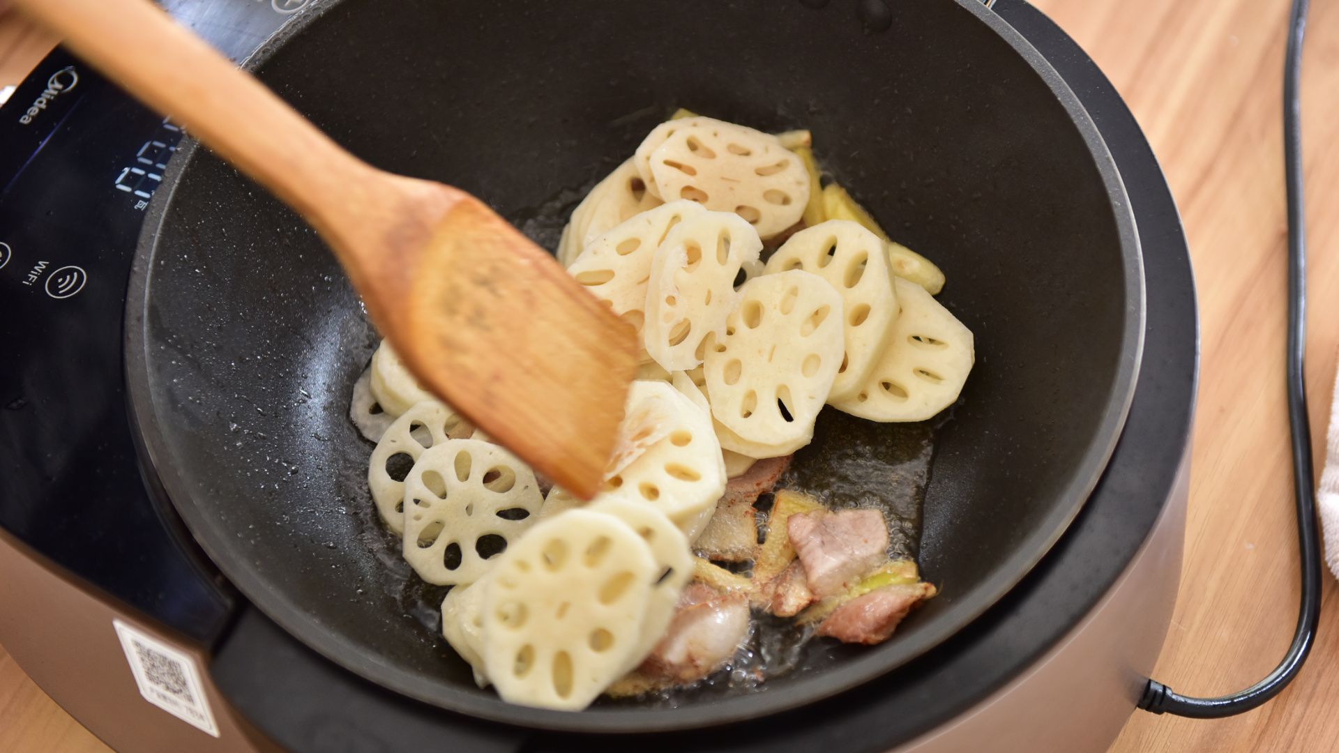 锅热倒油烧至六分热,加入蒜瓣、姜片爆香,倒入五花肉煸炒至变色,再倒入藕片翻炒,将部分调料加入锅中搅拌均匀
