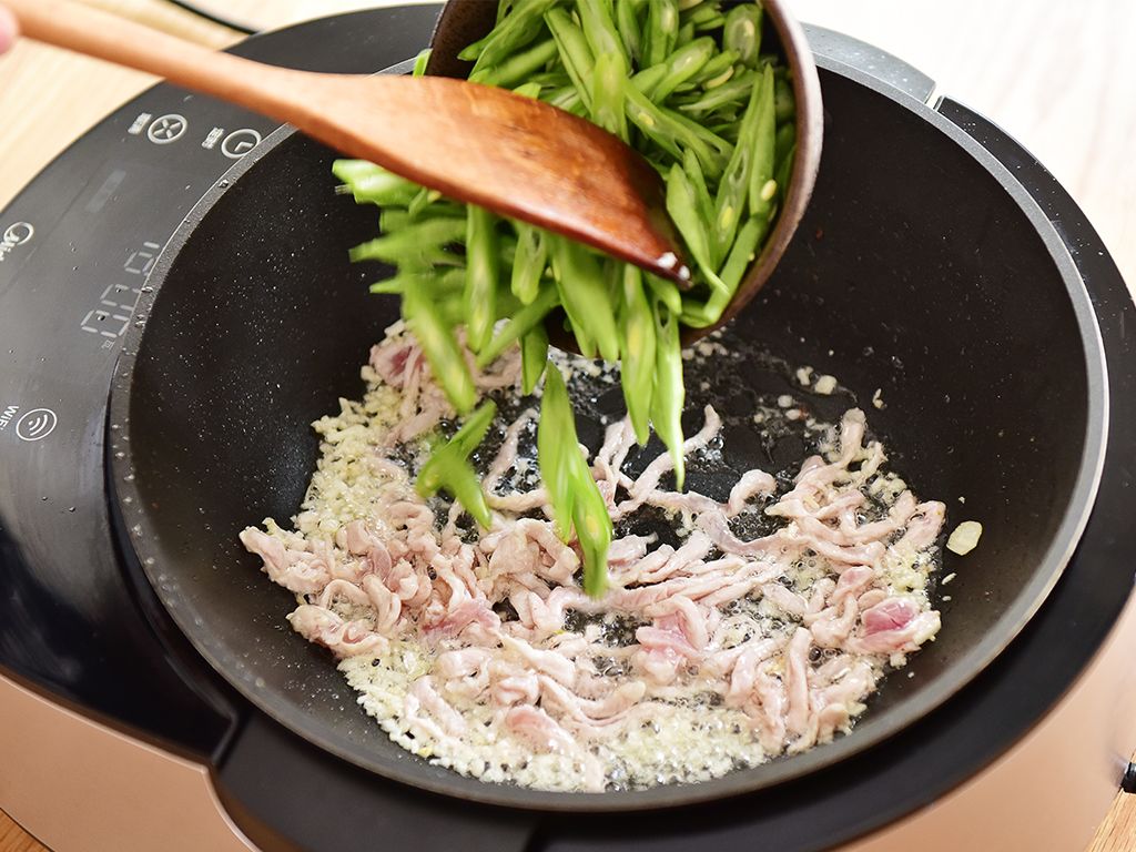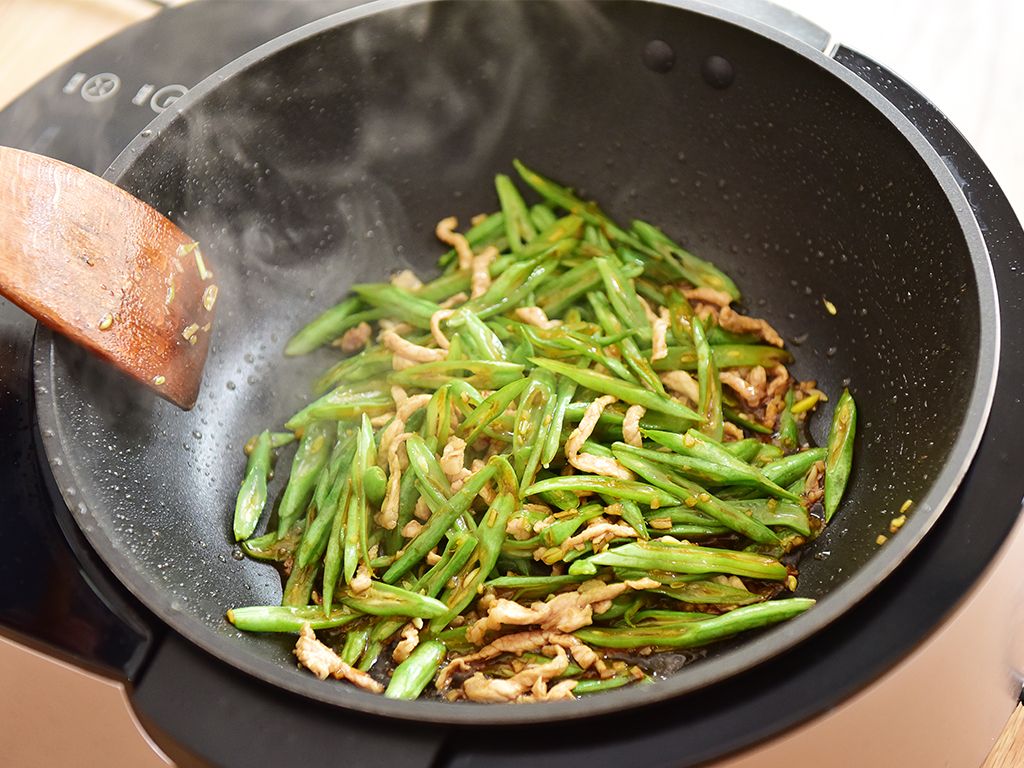 锅热倒油至6分热,将猪肉放进去翻炒,待猪肉略为变色,放入焯好的四季豆翻炒至九分熟。放入适量调料调味