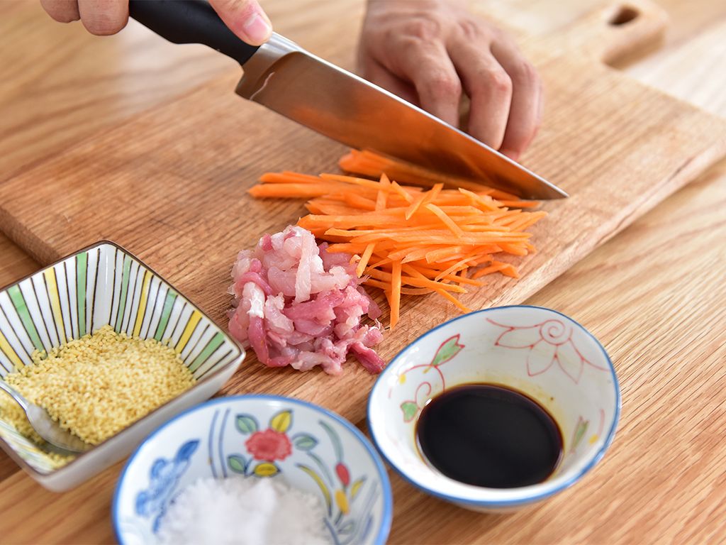 将瘦肉切丝加入淀粉、生抽抓匀,将胡萝卜切丝