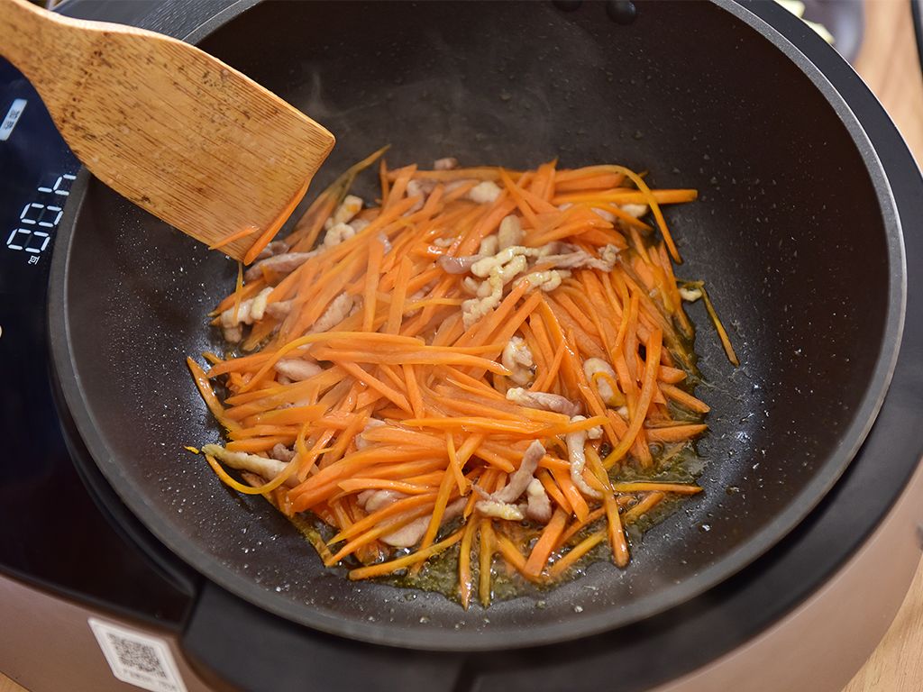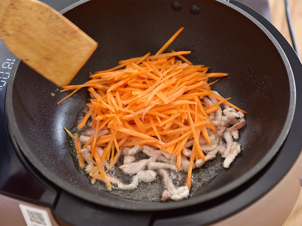 锅热倒油至6分热,将蒜瓣、姜片倒入翻炒爆香后加入肉丝翻炒片刻,再将胡萝卜丝倒入一起翻炒
