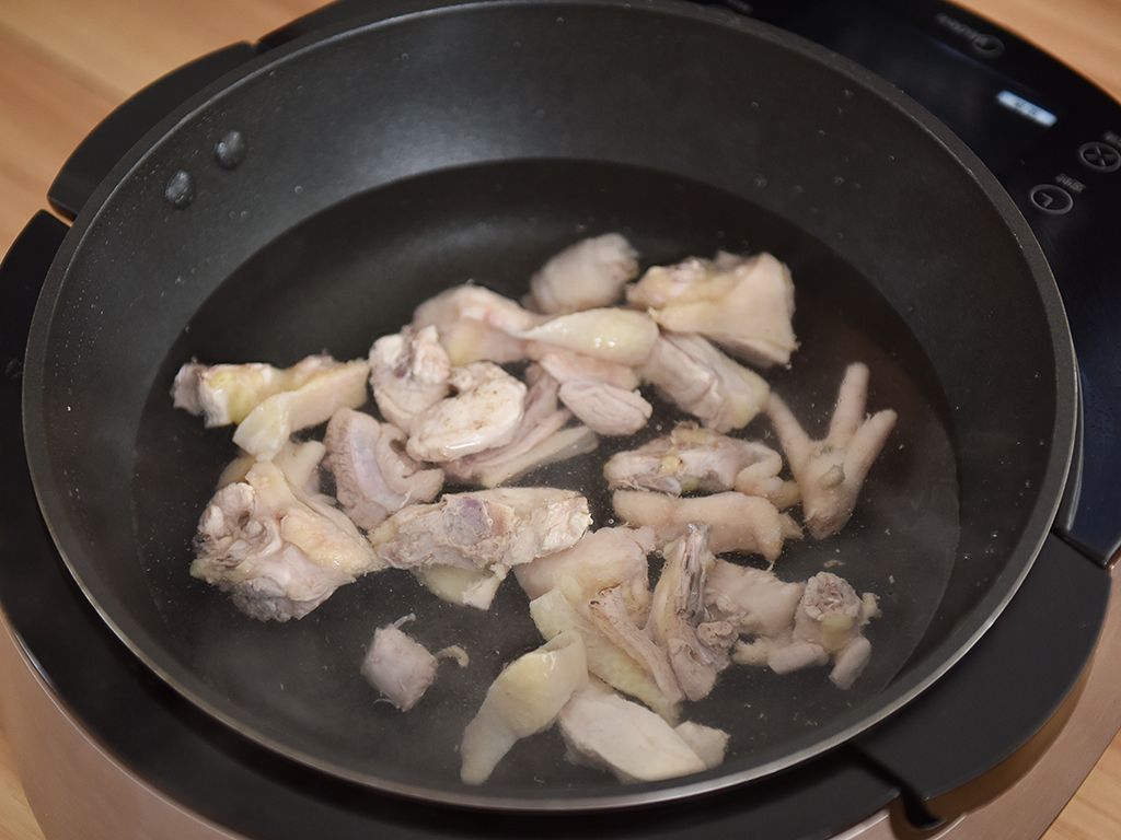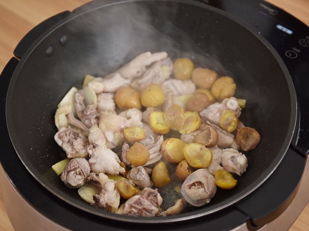 锅中倒入油加冰糖炒化,加入鸡块炒上色。加葱姜蒜爆香。沿锅边淋入一大勺黄酒和一大勺生抽。加入水末过鸡块煮20分钟左右再加入熟板栗煮15分钟