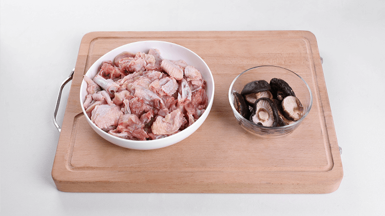 1、用清水泡发香菇约 3小时。 2、鸡肉洗净,剁块放入碗中。 3、加盐3小勺、糖1大勺拌匀腌制20分钟 。