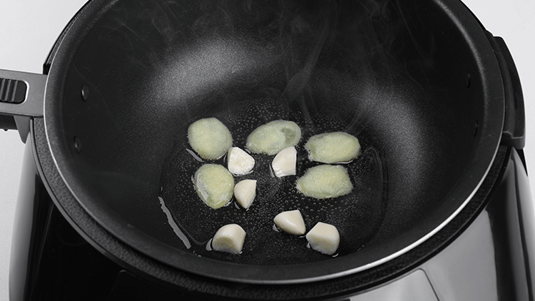 1、放入食用油3大勺、 生姜5片、蒜瓣3瓣爆香