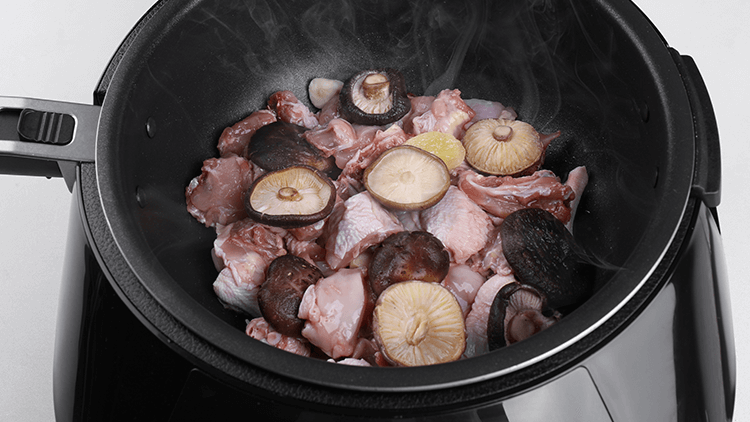 1、放入鸡肉、香菇、胡椒粉4小勺。