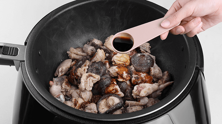 1、放入黄酒1大勺、生抽1大勺、老抽0.5大勺。