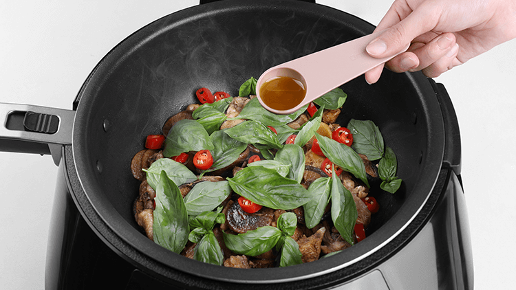 1、放入红杭椒30克、罗勒20克。 2、合上锅盖,开始烹饪。 3、放入葱花、麻油1大勺搅匀出锅。