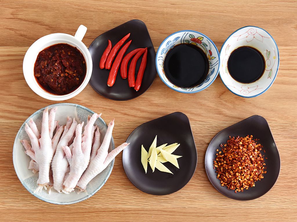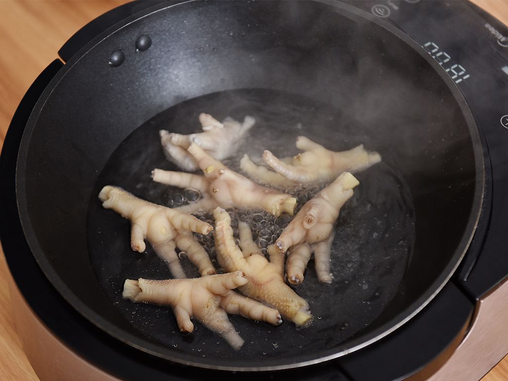 凤爪洗净,剪去指甲后入沸水焯两分钟,捞出沥干水分之后入油锅炸至鸡皮起皱