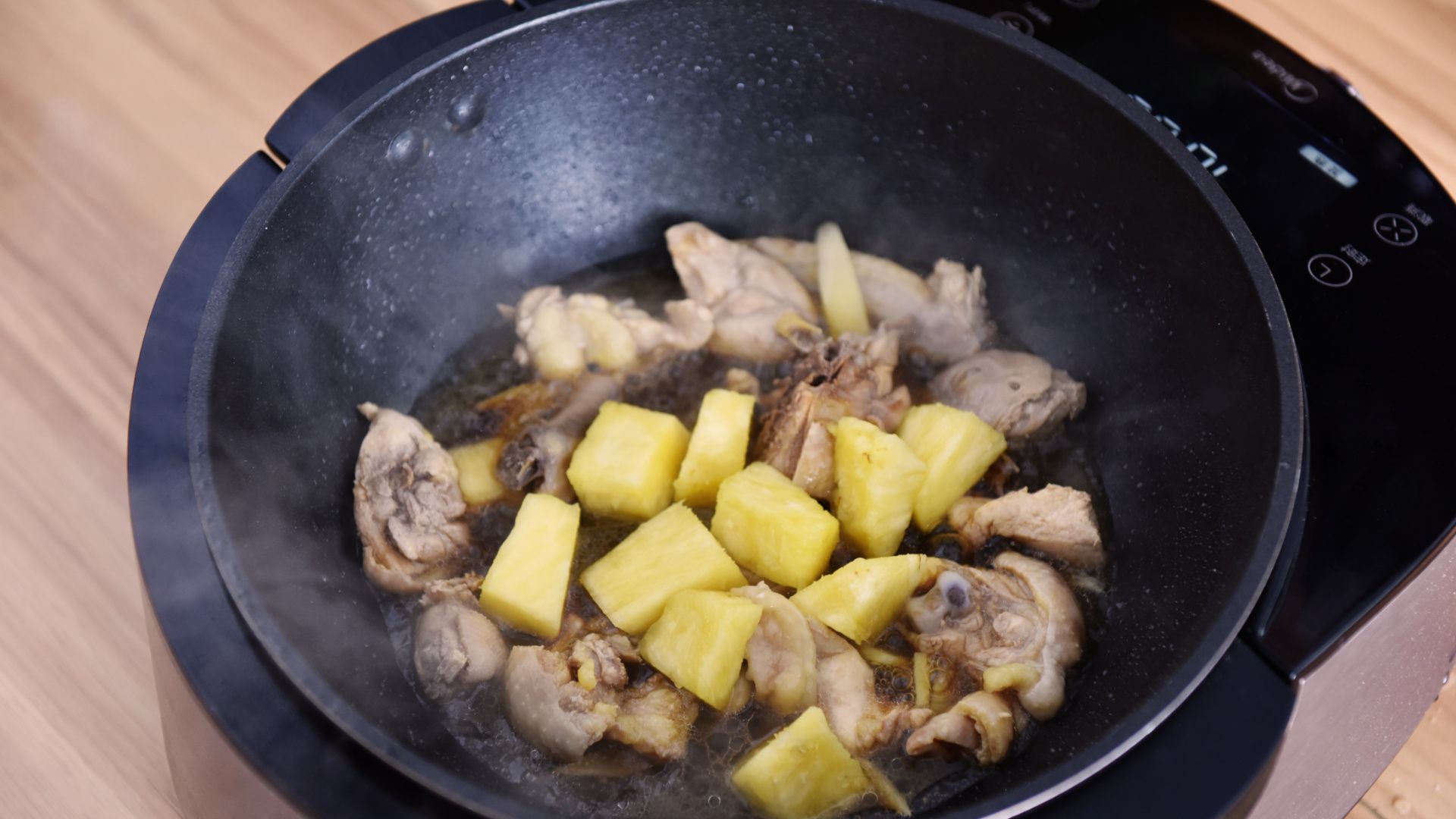 炒菠萝丝、鸡丝、嫩姜丝,加入盐等调味