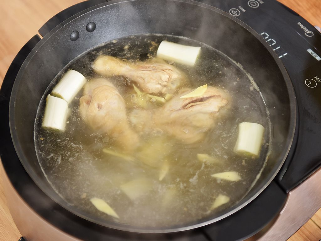 将鸡腿加料酒、姜、葱启动口水鸡程序