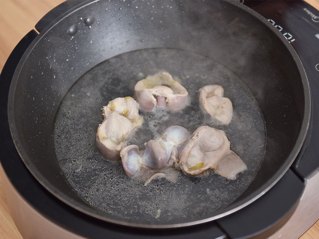 将鸡胗过水切小块,酸豆角切段,大葱切段