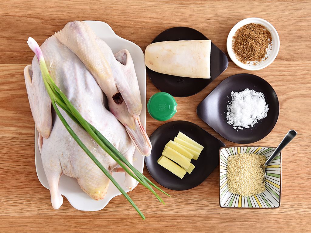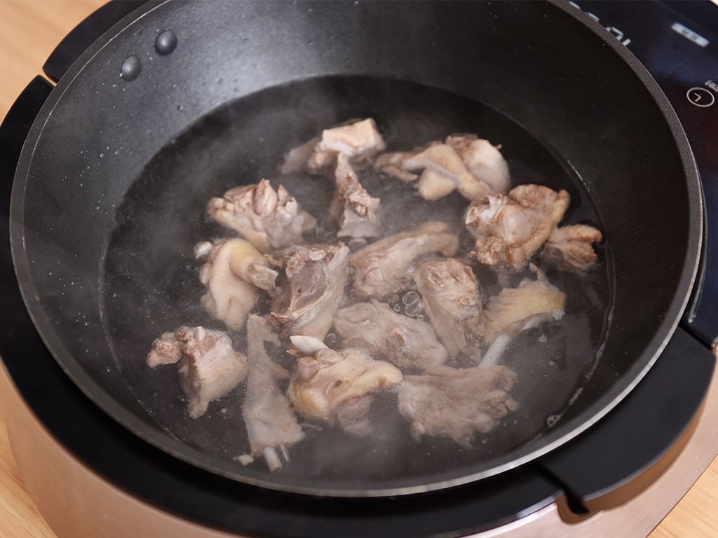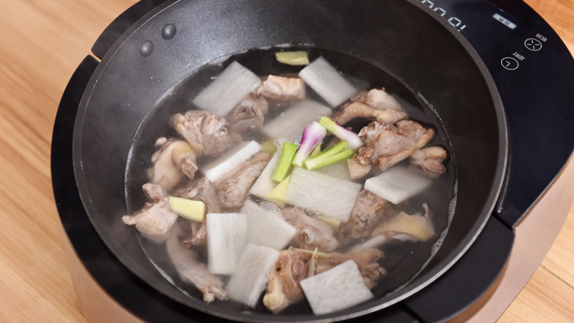 将鸭块倒入干锅中翻炒,待水汽收住即可(不用另外加油),水烧开后倒入炒好的鸭块、萝卜,加入备好的老姜、花椒。 用炖锅慢火煨上两个半小时即可。