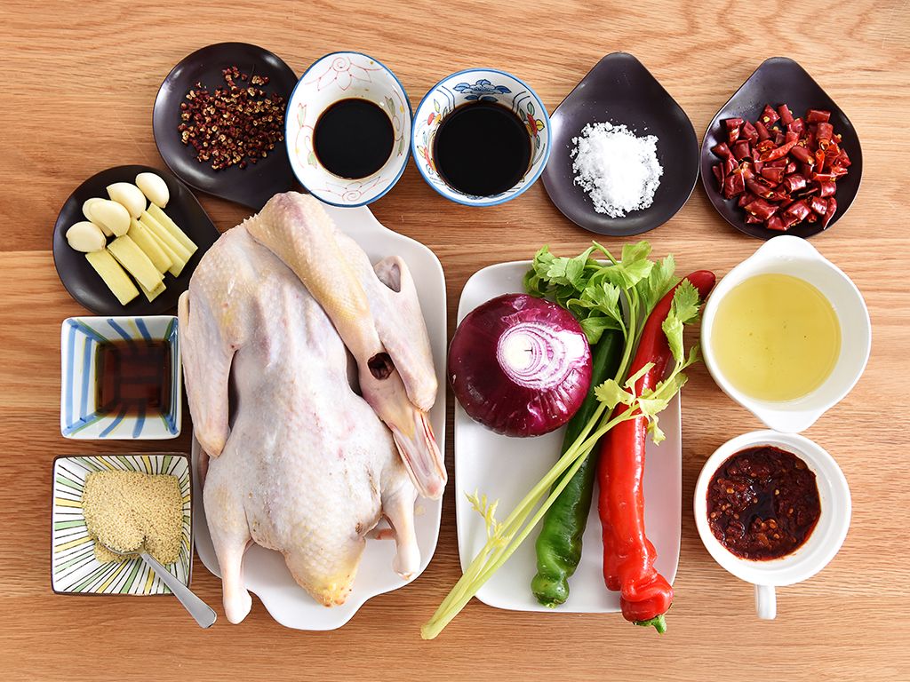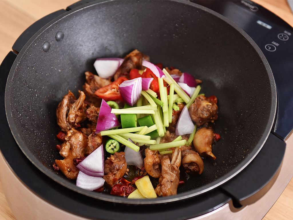 将鸭过水切块、青红椒切圈、芹菜切段、洋葱切片、干辣椒切段