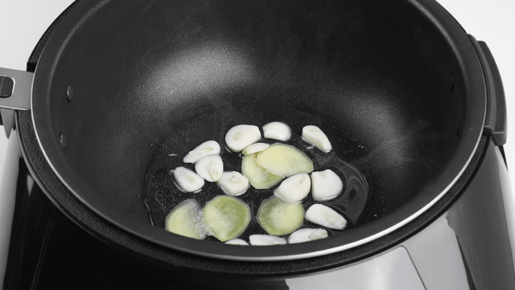 1、放入食用油3大勺、生姜5片、蒜瓣4瓣。