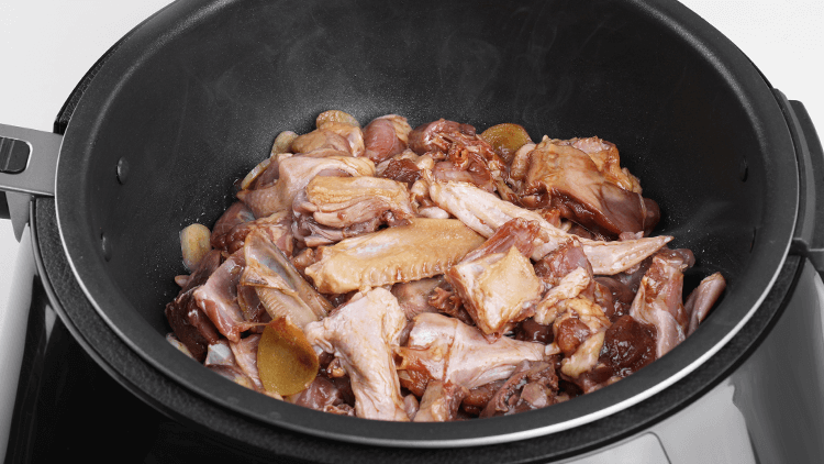 1、放入鸭肉、老抽 0.5大勺、生抽 1.5大勺。
