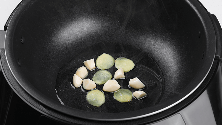 1、放入食用油3大勺 、生姜5片,蒜瓣4瓣 。