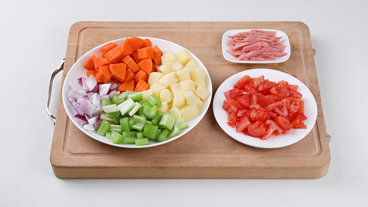 西红柿去皮切丁;土豆、胡萝卜去皮切丁;洋葱、西芹切丁;红肠切丝。