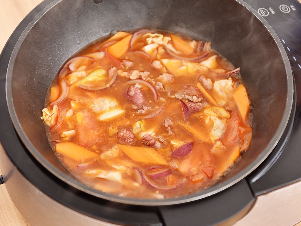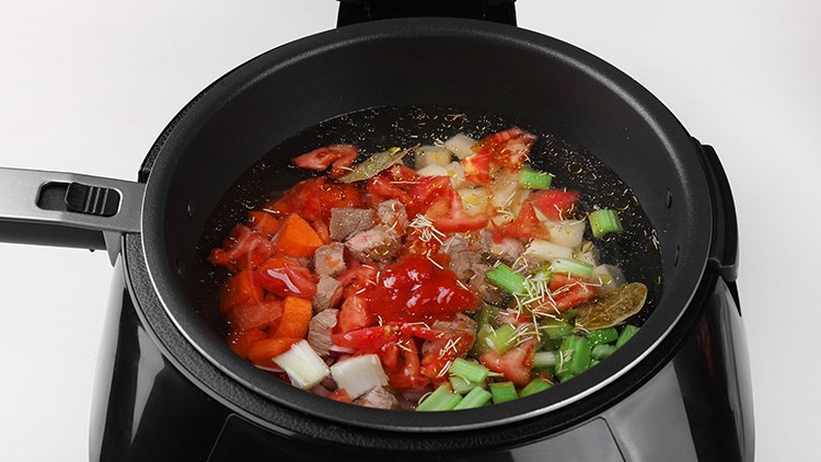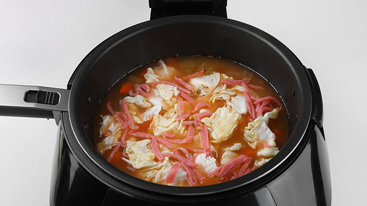 除卷心菜、红肠丝、盐、黑椒碎外,将其它材料放入锅中,启动程序。