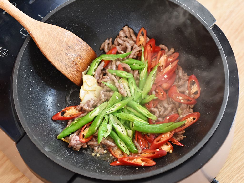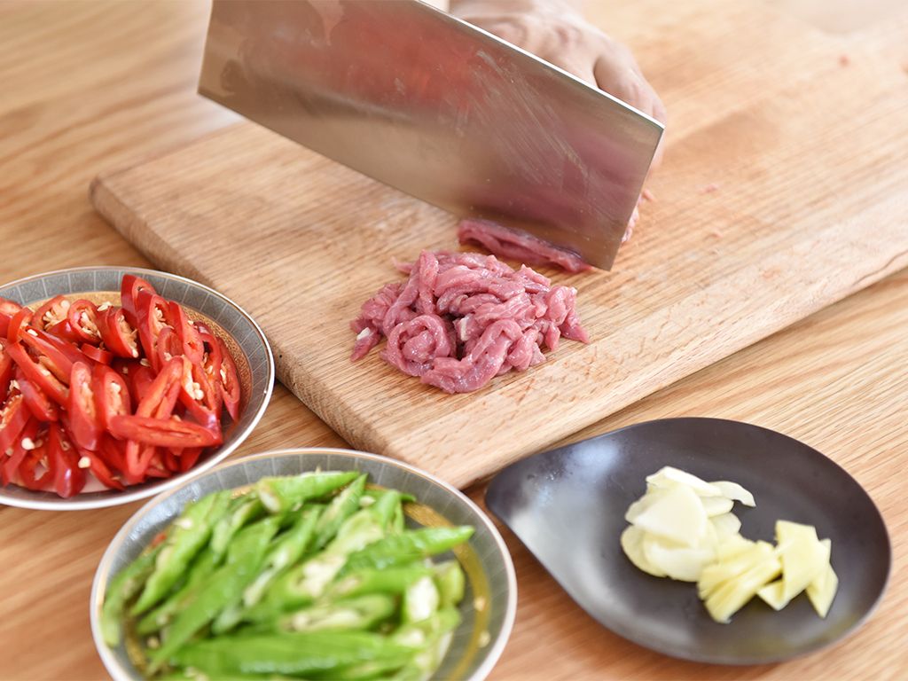 牛肉切丝,红辣椒切片,姜蒜切片。
