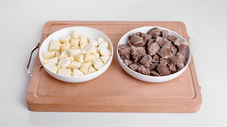 1、羊肉切成肉块、焯水洗净 2、山药切块