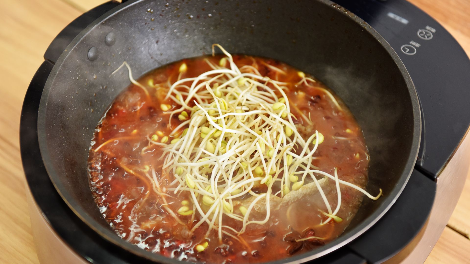 炒锅烧热,然后放入火锅底料、豆瓣酱炒香。再加入干辣椒段、花椒、蒜末、姜片一起炒,炒出香味。再将鱼头和鱼排放入炒匀。加入酱油、料酒、糖、胡椒粉一起炒。最后加入清汤(或者开水),没过鱼肉。汤烧开以后,将鱼片一片片地放入,用筷子拨散,再放入豆芽煮片刻(也可以提前把豆芽煮好铺在深盆中)。待鱼片煮变色以后关火,倒入深盆中