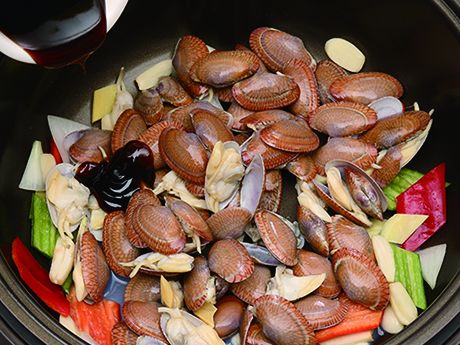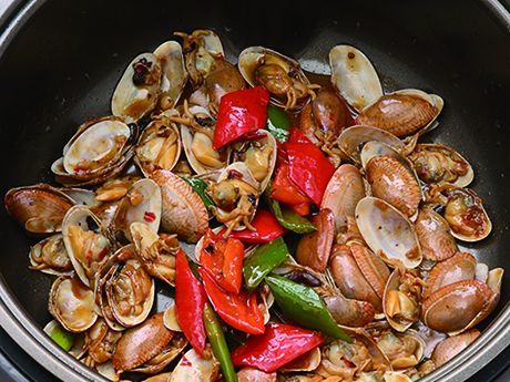 撒入调好的调味汁,盖上料理机盖,选择豉椒炒花甲功能按下开始,功能结束后即可出锅。